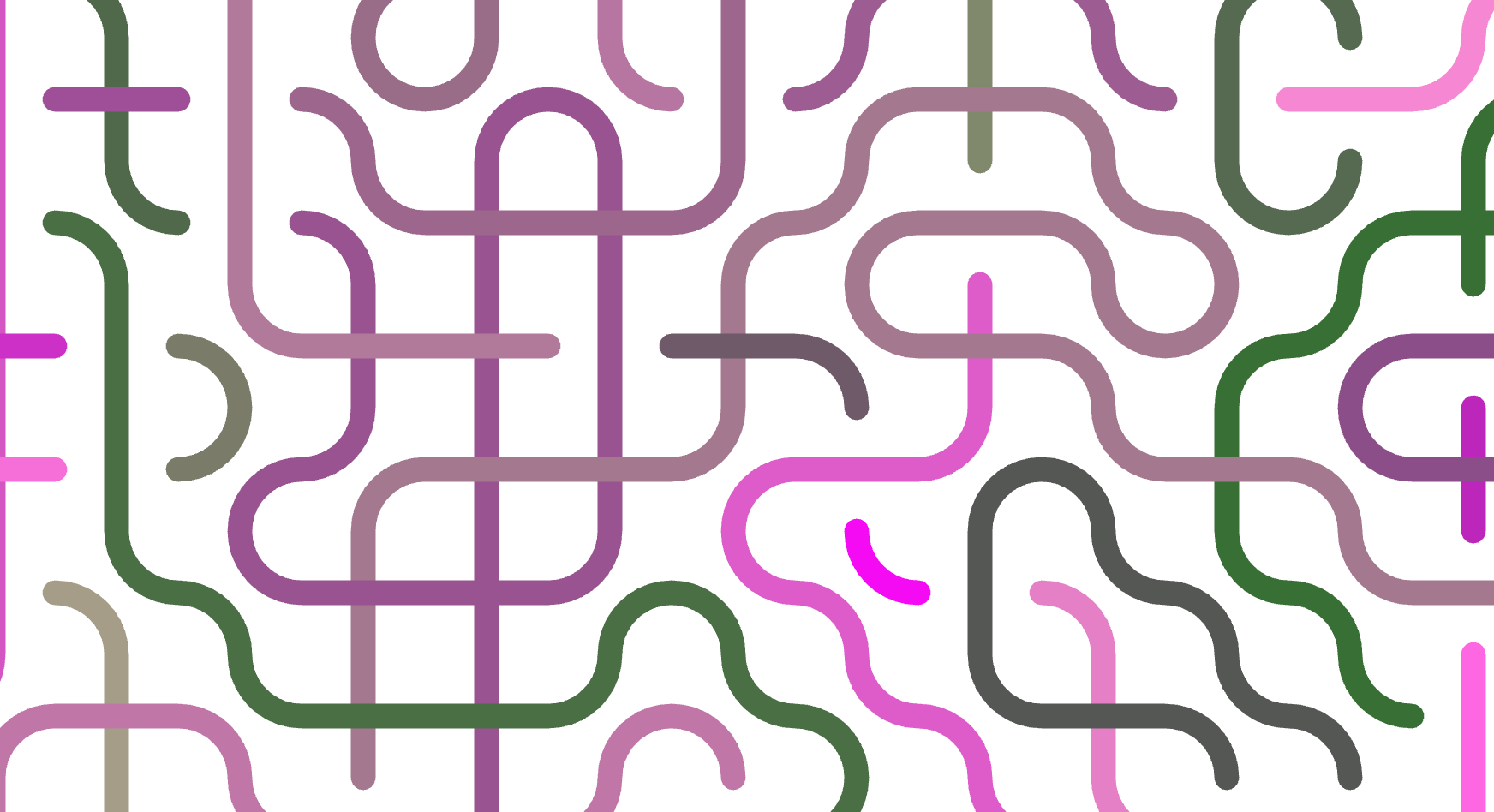 Connected segments of the pattern are colored, and the colors are updated every time a tile changes. I used triad matching to generate a color palette.